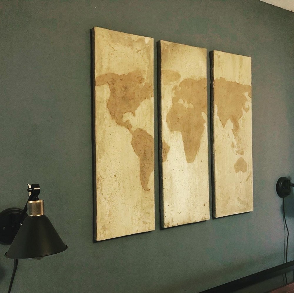 Next I let the concrete dry and the next morning it looked great! This was the easy part though! Now I needed to find a 3’x3′ map that fit the inside of this map evenly. I couldn’t seem to find one anywhere, so I went around my school to all the history teachers rooms and when no one was there I traced one of the maps. Then I took it home and cut out the pieces and traced it onto my own map.